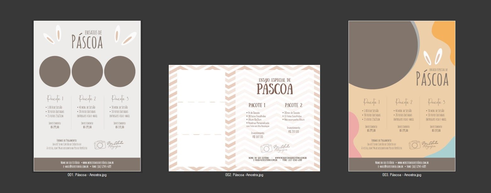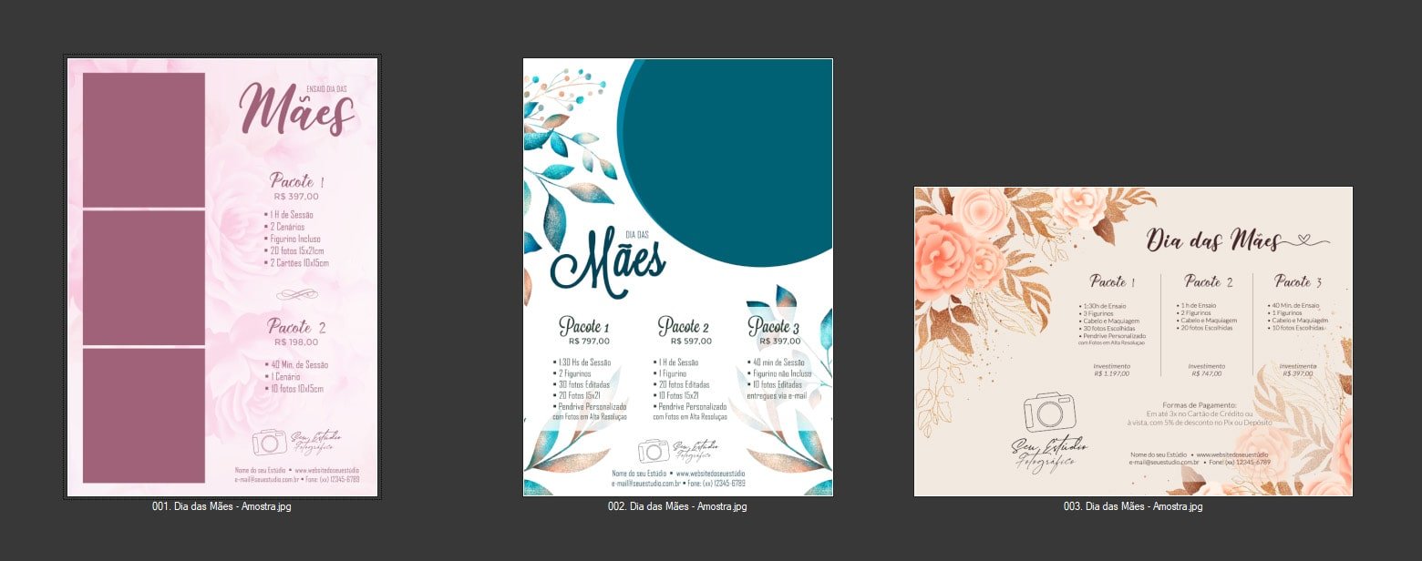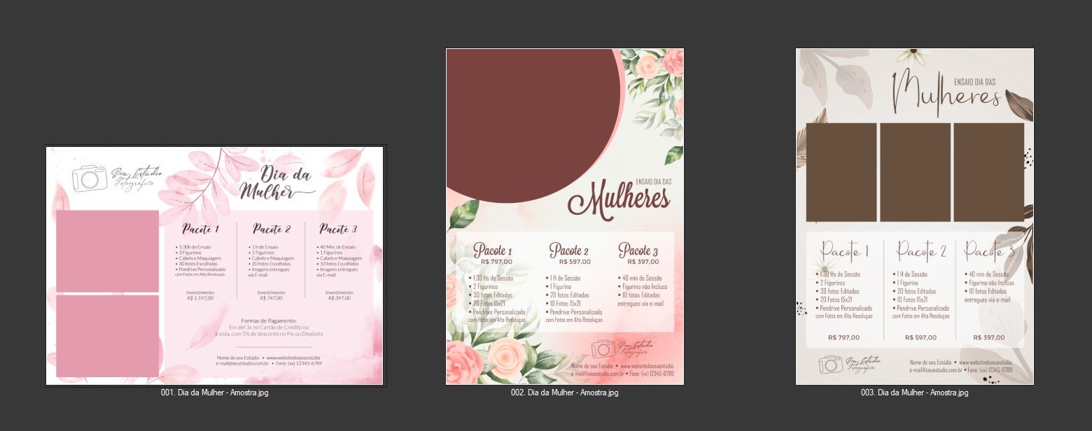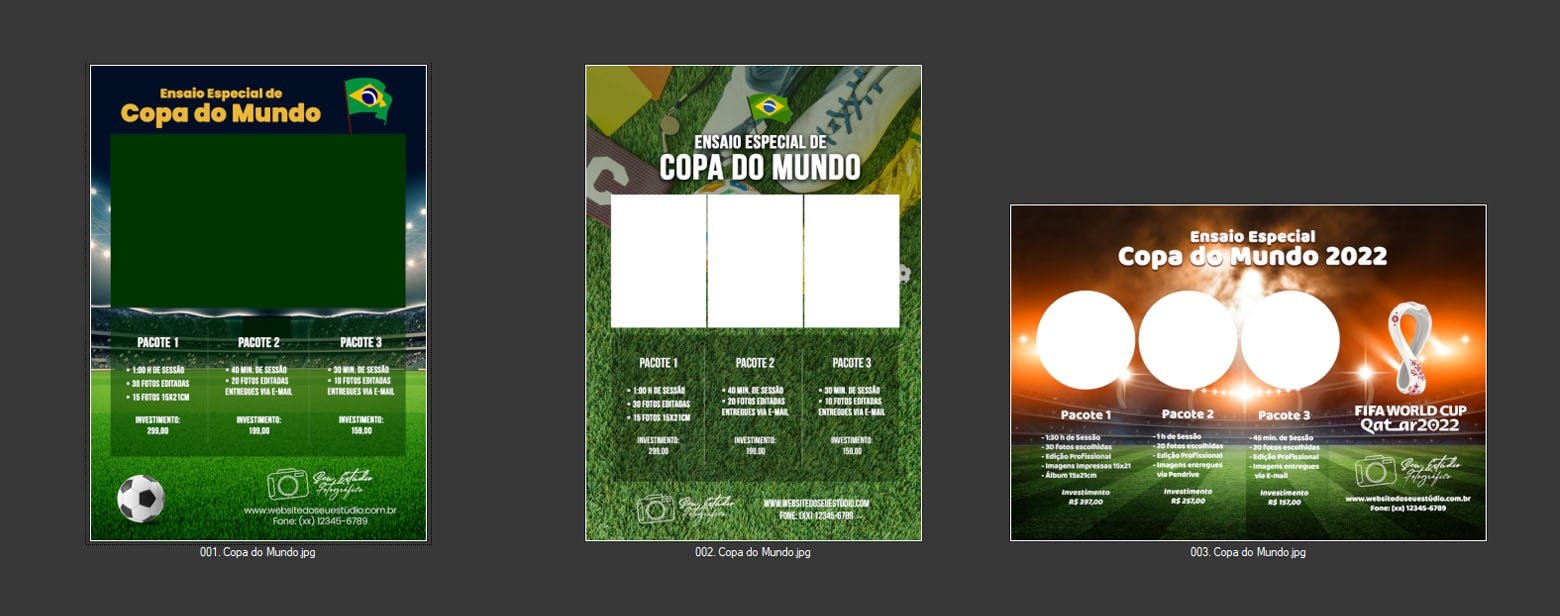 E foi pensando no quanto a nossa vida é corrida e em como o nosso tempo é limitado, que desenvolvi uma Coleção Completa com 36 modelos de Propostas de Orçamentos Editáveis no Photoshop, (3 para cada Data Comemorativa do ano incluindo a Copa do Mundo) para que você possa apresentar suas opções de pacotes e valores de maneira prática, bonita e profissional.